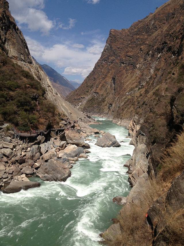 虎跳峡真得很雄伟,虽然云南干旱,但虎跳峡的水很对的起这个名字,开始段,江面雄壮开阔,山峰巍峨,越往里走越窄,特别是虎跳石处,江面陡然变窄,江水湍急如千万匹马飞奔而来,观景台处,风吹起水雾一片,让人越发感觉到自然的伟大,发了好一会呆才往回赶。