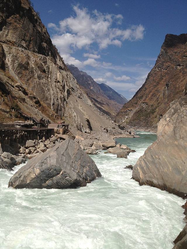 中午是全素宴,女生倒无所谓,男的就比较悲催,特别是下午要征服中虎跳的同胞们,只能混个饭饱了。到虎跳峡已经2点了,我们选择的是上虎跳,事实证明非常正确,丽江白天非常炎热,爬忽上忽下的中虎跳耗很大,而上虎跳都是栈道,非常好走,更主要最重要的是看到的风景没啥区别,上虎跳在虎跳石这里也可以拾极而下,感受虎跳峡的雄伟,除非你是想挑战自己,想去感受勇敢者天梯的人,否则就不要自虐了。