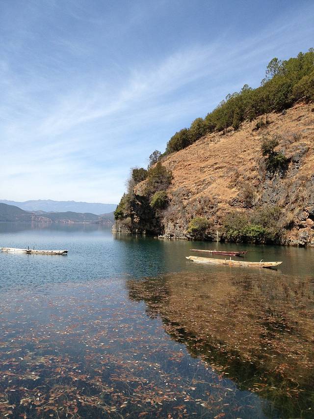 一路走走停停,一路美景好不惬意,李师傅说格桑花开的时候环湖最美。赵家湾是绝对的亮点,人少,安静,湖水比里格还清澈,片片花瓣飘落在湖水中,绝对是个发呆的好地方。除了门口的饭店,没有任何商业的痕迹。环湖的最后一个景点是走婚桥,这个季节草海是金黄的,且水很少,感觉很一般。走婚桥有卖苹果干,5元一包。