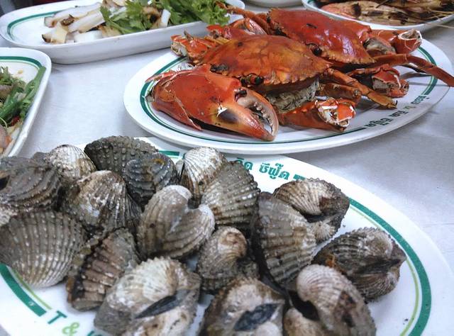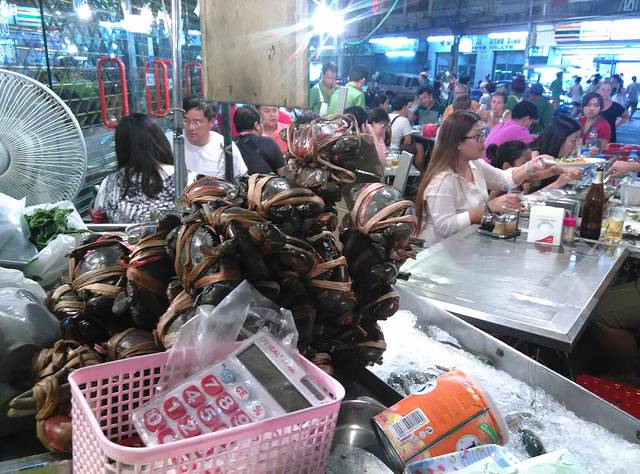 我们到的就是中国城最著名的海鲜摊位叫做T&K海鲜。每天傍晚,随着顾客的陆续到来,海鲜摊的折叠桌,塑料椅也开始向街头延伸。新鲜的海产展示在店门口,煎煮炒炸皆宜。