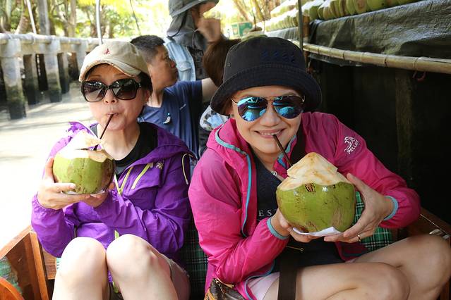 摊位就设在两边的岸上,这不,这里有个卖椰子的摊位