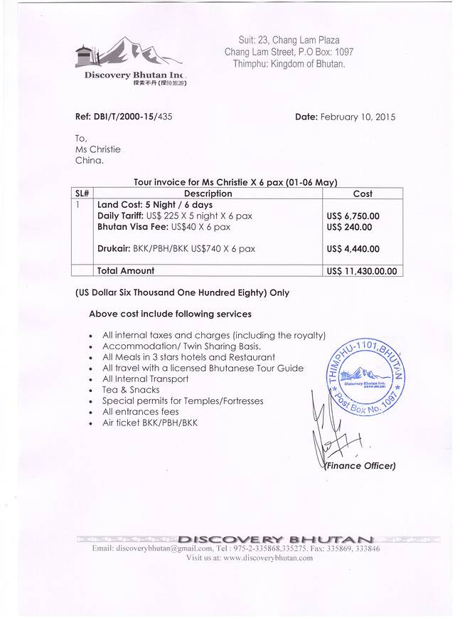 因为考虑到在不丹的饮食都以素菜为主,而我们这帮吃客都是无肉不欢,所以在计划中安排了在曼谷转机,希望在不丹之行结束后,可以在曼谷调整几天,尝遍泰国的美食和水果。通过去过不丹的朋友,介绍了不丹当地的一家旅行社,通过微信和邮件沟通及提供报价,发现价格便宜了不少,价格很透明,就是250美金X5晚+曼谷至不丹的来回机票740美金,总价每人1905美金,合人民币12000元左右。(国内和国外的价格差异相当之大哦!!!)