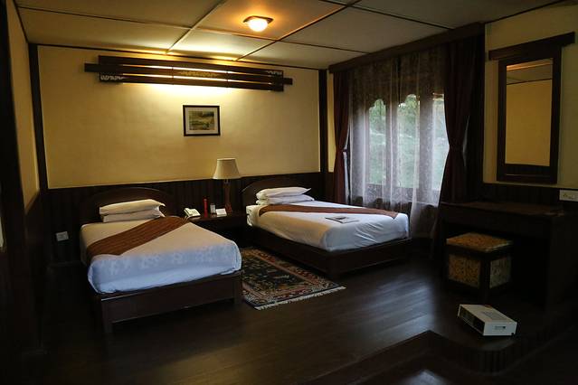 不丹旅行包含在250美金里的酒店基本都是三星级酒店,今天入住的这个酒店虽然不怎么豪华,但是胜在地理位置优越,房间还是很干净的,卫浴设施也一应俱全,有洗发水沐浴液还有牙刷浴巾。