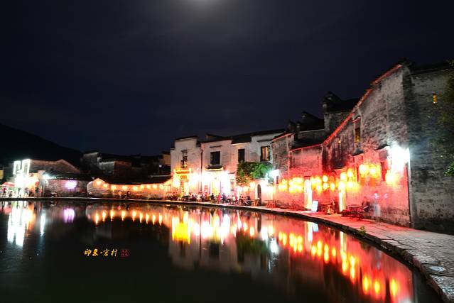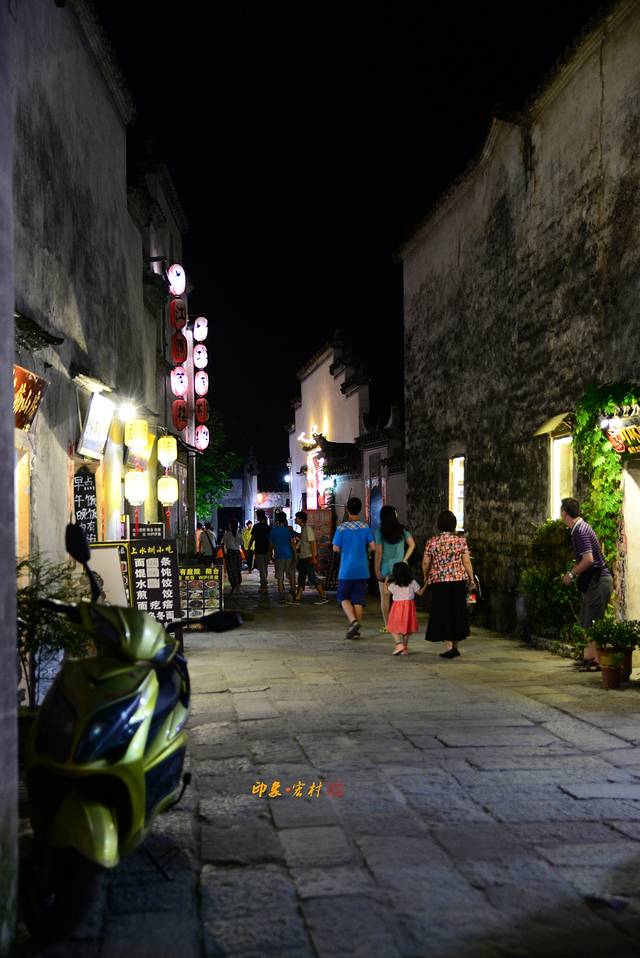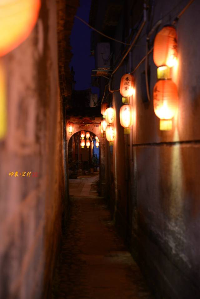 此时进入宏村已是黄昏刚去,夜色刚起,宏村不大,但是进去后且感觉自己迷路了,有种不识庐山真面目、只缘身在此山中的感觉,对于摄影来说,宏村之中的月沼和南湖是必去之地,跟着行人漫无目的的走着,不知不觉的就到了月沼,周润发演的《卧虎藏龙》中李慕白蜻蜓点水追玉娇龙就是在这里拍摄的,这时候的夜色已深,只能使用三脚架,一些巷子里面的只能使用高感来拍摄了。拍摄完月昭的夜景后顺着路边的指示牌子向南湖走去,说句实话,宏村里面的路线标示太少了,以至于第一次来根本就不会走,还好现在的智能手机都有GPS,下个地图软件就可以,在这里比较推荐的时百度地图,更新快,实用!宏村里面的巷子晚上是比较黑的,没有那种特别亮的照明路灯,大多的都是一些彩灯,所以晚上去的话建议带上一把手电时比较不错的。南湖的话晚上很黑,走在这里要小心掉进湖里面去了哟,与其说湖不如说池塘更恰当,既然你名字较南湖,那就称湖吧!