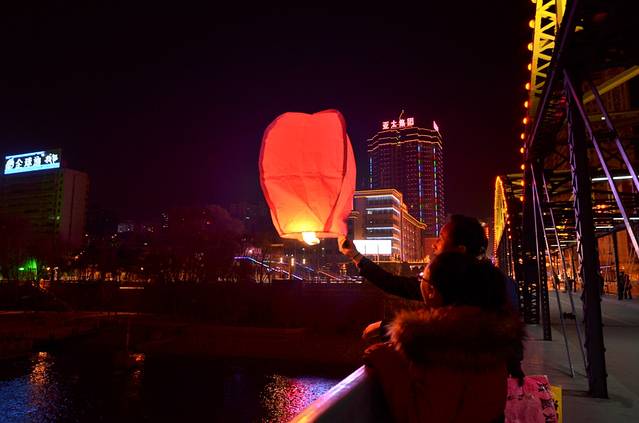 当晚多云,大桥上好些人在放孔明灯祈福。