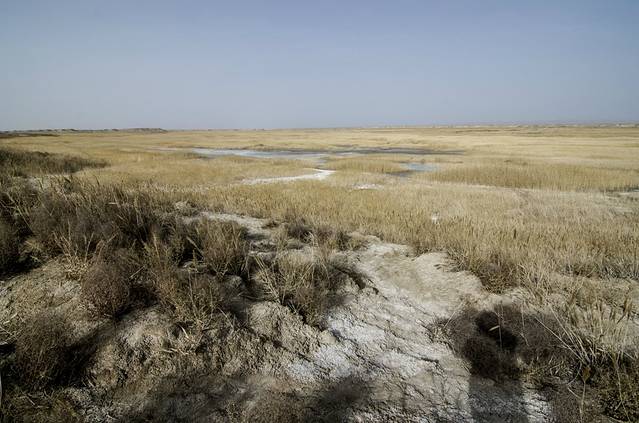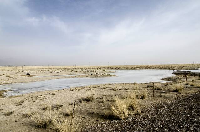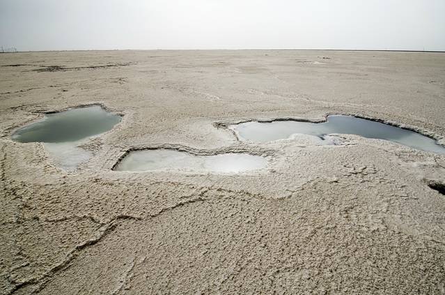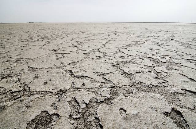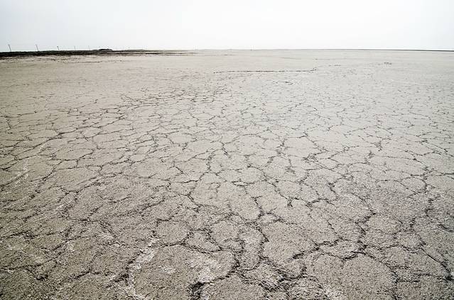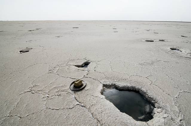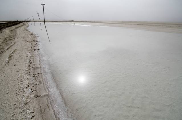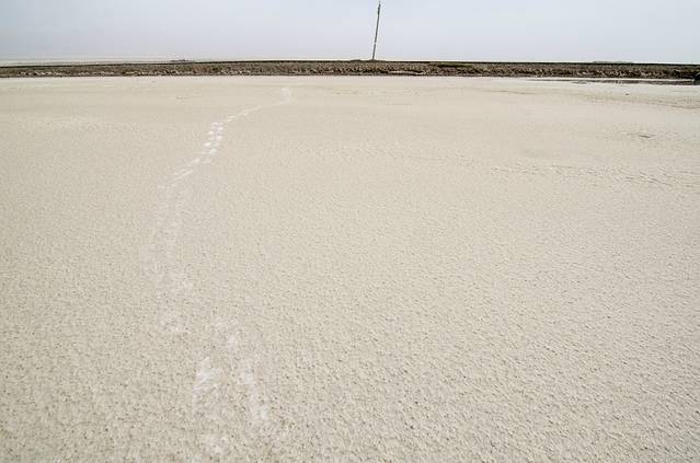印入眼帘的便是一望无垠的盐湖,咦?不对啊 怎么湖面黄的跟戈壁滩一样,不是盐么?白的啊?之后在盐湖上,边漫步,边分析这个问题,思考的结果是:可能是冬天,温度太低,碱密度低,浮了出来,然后在太阳的照射下变干,形成薄薄的一层。这也能够解释,踢开上面的碱层,便露出了下面白白的盐层。不过,这只是假设,如有不对,欢迎知道的朋友指正。
