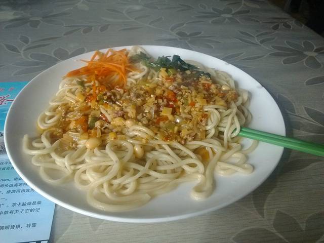 大巴中午到达茶卡,酒店安顿好,就近在骆驼美食城尝了下当地的干拌面,味道还不错。