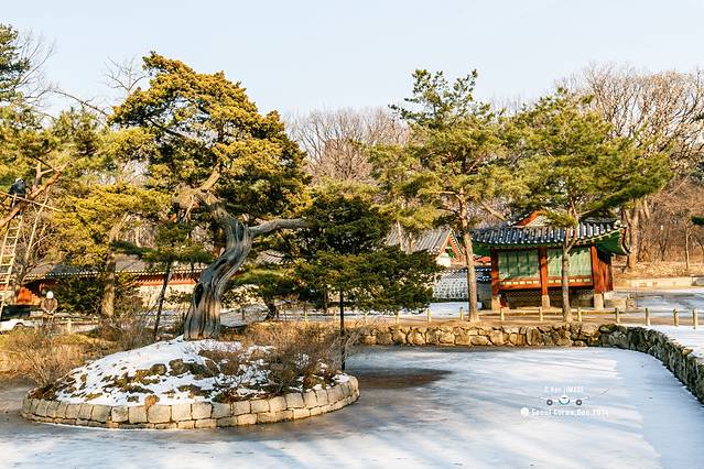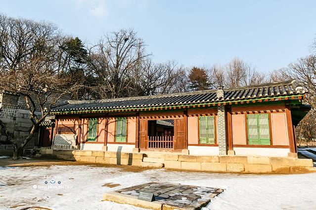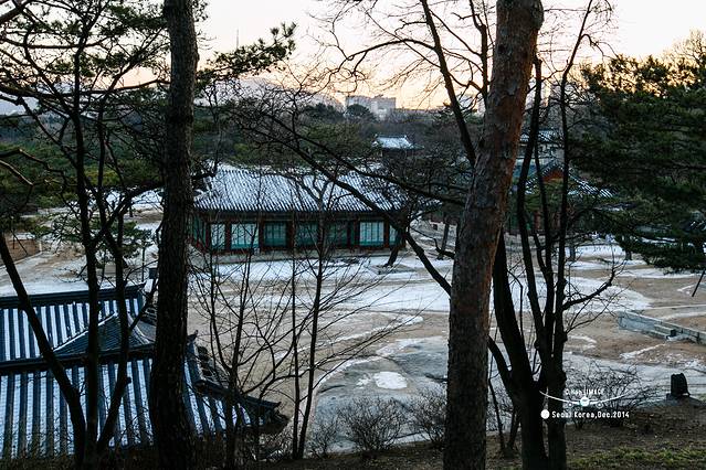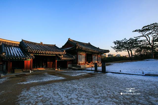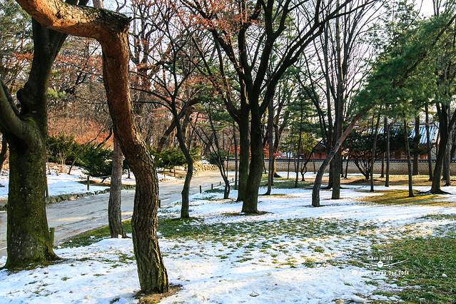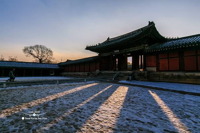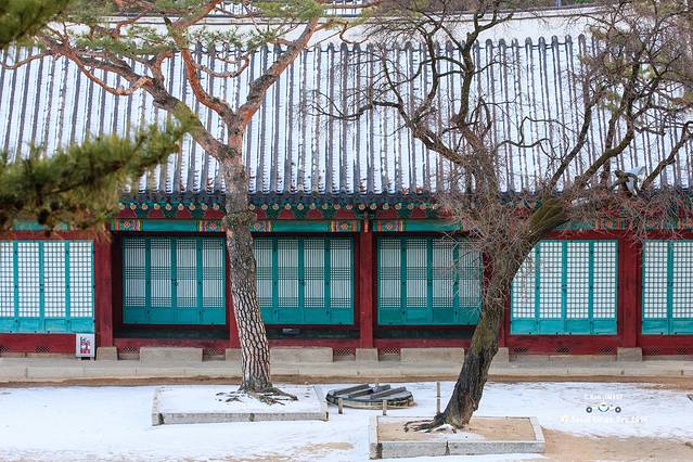 照片构图比较乱,因为宗庙的主路其实和天坛一样,中间的路是神路,人不能走,只能走在两边。但是韩国所有的宫殿里面除了主路以外的路上,都是铺着黄沙,这和日本庭园里面谱沙子是一个道理,就是为了防贼。这就导致,雪融化后喝黄沙就和成了泥,实在无法走路,所以,只能凑合看了。