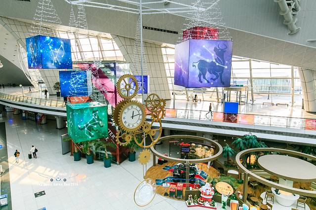 机场快轨的等候大厅里面,亮亮堂堂的,挂着蛮喜庆的星座挂饰。