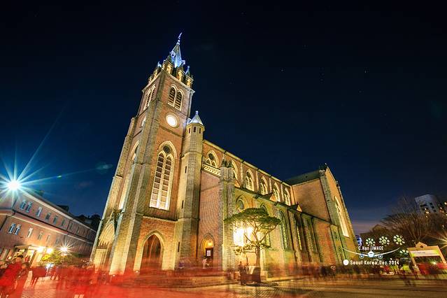 明洞天主教堂,一座简单的哥特式建筑。还是回来才注意到,在这张照片上,教堂正好在猎户座的映衬下。