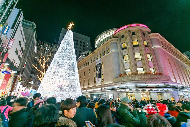 从东大门直接坐地铁到了传说中的明洞,平安夜真是人多啊,出地铁都是一个困难的事情。以为明洞就是一条街,结果还真的不是,是呈井字分布的一个商业区。如果想直接进入中心区,从地铁4号口出来,要是打算去明洞2号街吃饭的话,从8号口出来比较方便一些。