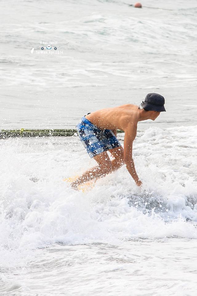 海边有人在冲浪,还真是第一次看到真人在冲浪,感觉没多大的浪啊,这怎么冲啊?这哥们,还真一次又一次的努力,但也没冲起来,呵呵。