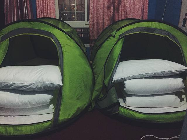 其实看上去还不差啊,哈哈哈,第一次住帐篷竟然在室内,我们还有准备!把帐篷拖到天台!怕半夜卷走,于是还是很安分呆在屋里