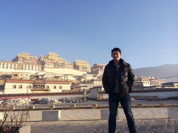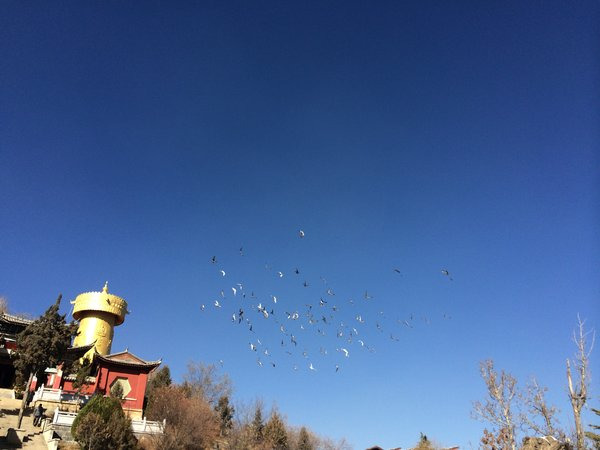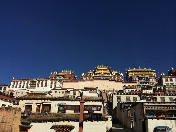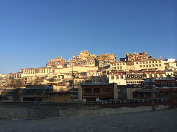 清晨的温度比玉龙雪山还冷。湛蓝的天空万里无云,在阳光的照射下金碧辉煌,震慑人心,不愧有小布达拉宫之称。寺里的147级阶梯在高原上爬起来还是有些气喘。