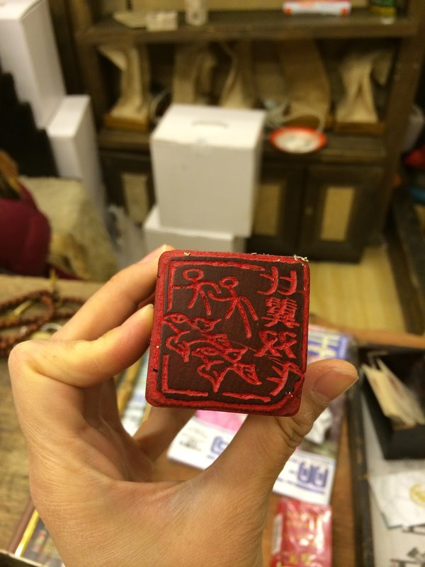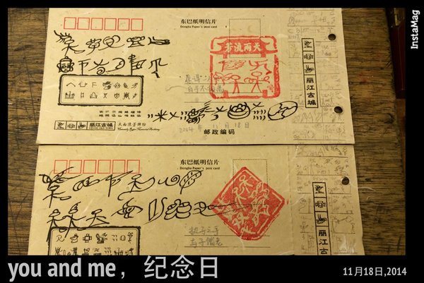 我选择了一套明信片,淡黄色的东巴纸配上黑色的签字画。我特别喜欢它那种透露出来的淡雅,我一见倾心。幽默的纳西族老板首先用纳西文字写了一句话送给我:上善若水,胸怀若谷。