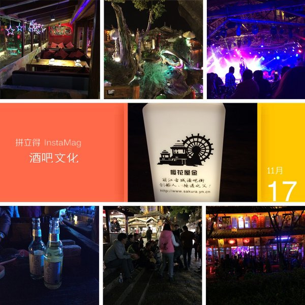 丽江古城酒吧分为HIGH吧、清吧、个性火塘酒吧。四方街那的酒吧一条街多数是HIGH吧,有名的酒吧有:千里走单骑、一米阳光、樱花屋金。无论是哪一个,都充满雾气、酒气、迷幻、躁动的音乐和穿梭的人群。