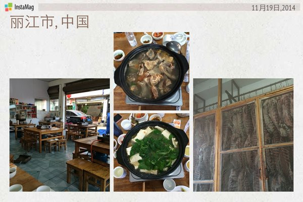 象山市场,那里有着好吃的当地的特色美食——腊排骨火锅。离束河很近,可以步行。从丽江古城打的过去也就十几元。进入象山市场大门直行400米后左转直行200米后就会发现好几家腊排骨火锅。我们去的早,还没有人,但到了饭点,就发现周围腊排骨店都冷冷清清,唯独这一家店门庭若市,而且大多是当地人,小矮木桌和凳子还挺有特色的。