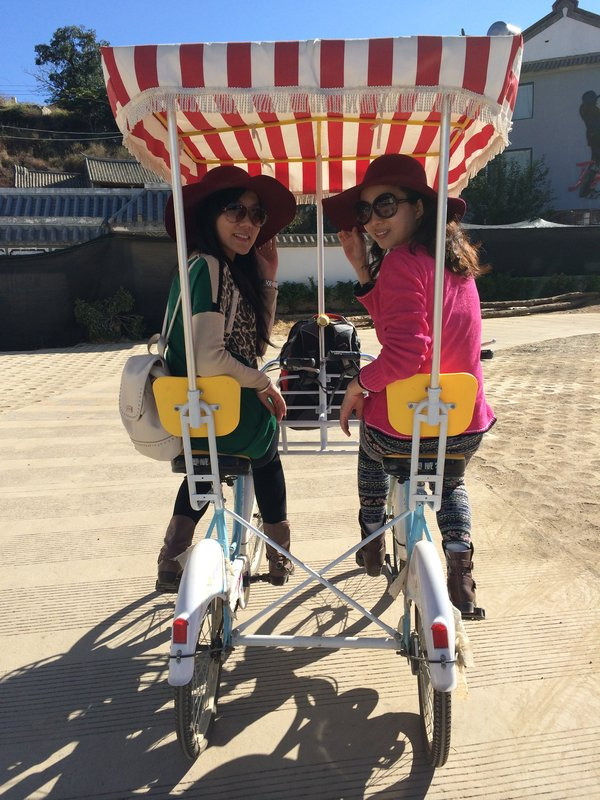 环游洱海的话建议租辆电瓶车,不会骑的话就租个单人单车,千万不要租双人单车。因为从客栈到洱海会经过双廊古镇,行人特别多,双人单车行动起来特别不便,而且上下坡特别不好踩。同行的姐姐开始租了双人单车,实在路途艰辛,后来只能返回换成了单人单车。