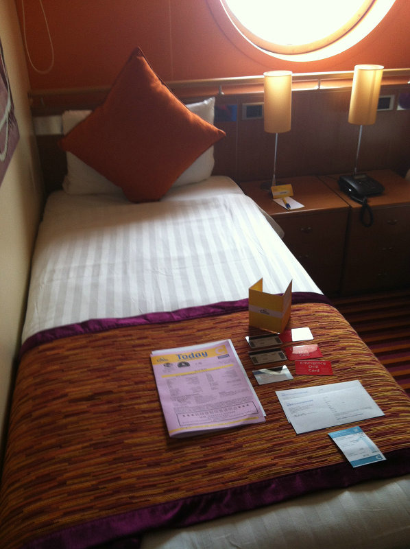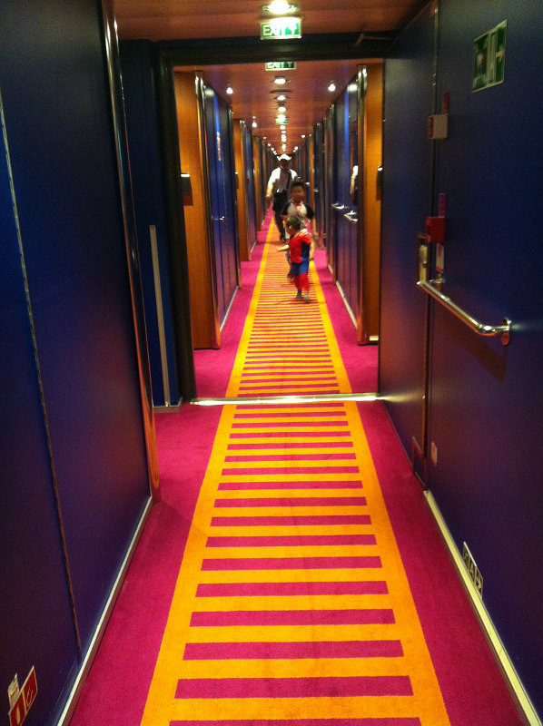 走廊很长,粉色和黄色的线条,看上去很悦目的。房间里有3张床,床上放着门卡和救生演习卡,还有当天的TODAY报纸。