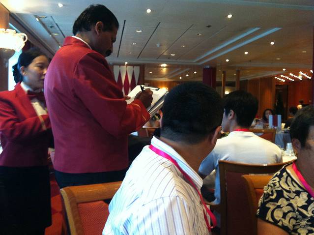 邮轮的正餐餐厅有2个,5楼和6楼都有,一般客人上船后就会收到就餐卡,规定你去那个餐厅就去那个餐厅,走错了没位置坐。