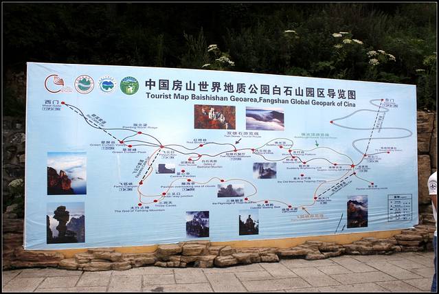 白石山大环游路线:太行老祖往左----南天门---绝壁长廊--在建中的第二条玻璃栈道---仙人晒靴--仙人桥--三佛朝圣--瞰海亭--在建中的西餐厅---三洞天---太行之神---飞狐峡---飞云口(步行或乘坐缆车25元)---心型栈道---百米玻璃栈道(5元)严重恐高可绕行---君临天下拍照玻璃台-----天衣有缝(一线天)---红桦林--餐厅就餐(可点菜,自助39元一位)---饭后兵分两路:较缓的路线1、走侧身崖-海豚出水--韭菜园。具有挑战性的路线2、白石山顶峰佛光顶(海拔超2000米)---五行台---紫阳顶---韭菜园。我们走的是路线2.