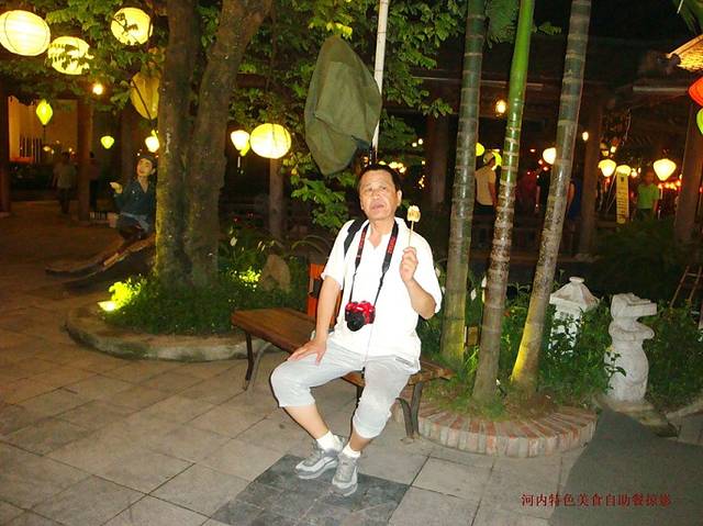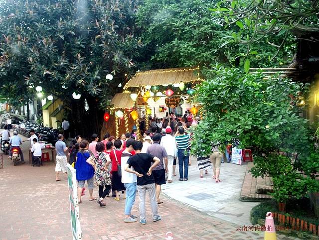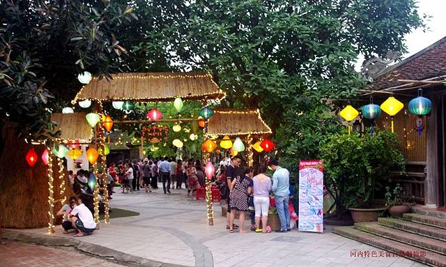 我们乘坐旅游大巴从下龙湾经由海防,返回河内。河内行程的第二站自费180元人民币品尝河内百家宴。因本人肾移植,除精猪肉、蛋类、牛奶、蔬菜外,其它肉类、飞禽、海鲜、豆制品一律不吃,饮食非常清淡,夫人和我朝夕相处,也习惯了这样的饮食。更值得说明的是吃鸡类飞禽,特别敏感,会造成呕吐。因此,没有参与河内百家宴自费项目的必要,一再劝夫人自己去体验一下越南饮食,但她也不去。我们随同跟团游团队的没有参加的团友,在附近找了家餐馆,每人花12元人民币吃的快餐。餐后回来等候参加百家宴的其它团友。观看百家宴现场的演出,逛拉逛的这里的外景,感觉河内百家宴不只是美味,还有迷人的夜色。