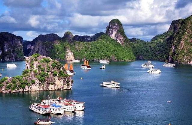 斗鸡岛、狼狗石、香炉山、天宫洞等、数不胜数的风景尽收眼底、下龙湾亦有小渔船如影相随,可向渔民就地购买些许刚打捞而起的各种鱼、虾、蟹等美味海鲜,让游船厨工加工烹饪。游船上把酒临风,去国怀乡之忧荡然无存,在天海一色中的游船上大快朵颐的美妙感觉在您的全身悄悄蔓延。乘越南特色红木游船,倘佯于万顷碧波之中;漫游被国际教科文组织评为世界自然遗产之一的“海上桂林”—下龙湾。1500多平方公里的海面上、耸立着3600多座大小不一、千姿百态的喀斯特地貌的山石、更以其“海美、山幽、洞奇”三绝而享誉天下。