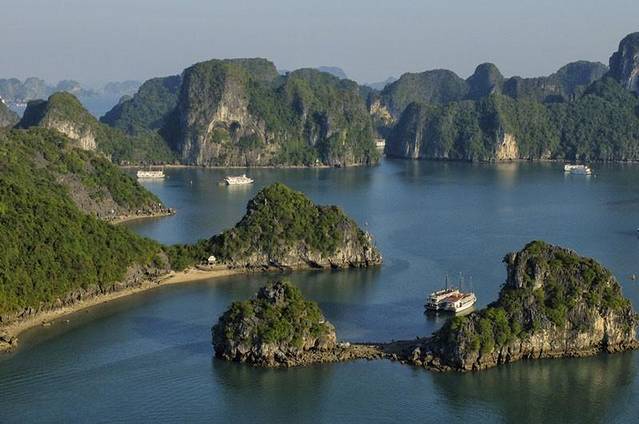 下龙湾是越南北方广宁省的一个海湾,距河内 150公里,属潮湿热带气候,1994年联合国教科文组织将下龙湾作为自然遗产,列入《世界遗产名录》。因其景色酷似中国桂林山水,因此称其“海上桂林”。下龙湾到处山岛林立,伸出海面的锯齿状石灰岩柱,星罗棋布,姿态万千,凭你的想象去猜测象形山石,有的如奔驰的骏马,还的如争斗的雄鸡,最有名的是蛤蟆岛,酷似一只蛤蟆,端坐在海面上,嘴里还衔着青草。据科学考证,这里原是欧亚大陆的一部分,后沉入海中,形成了这种自然奇观。