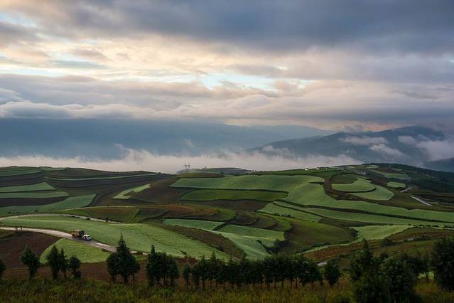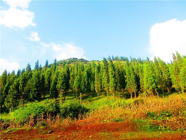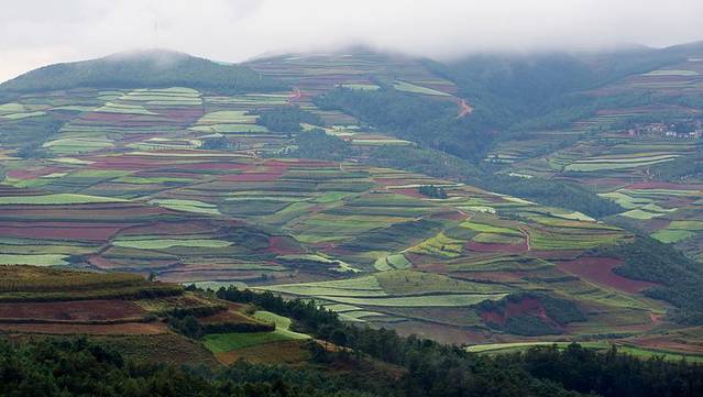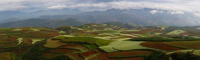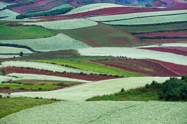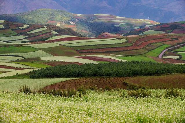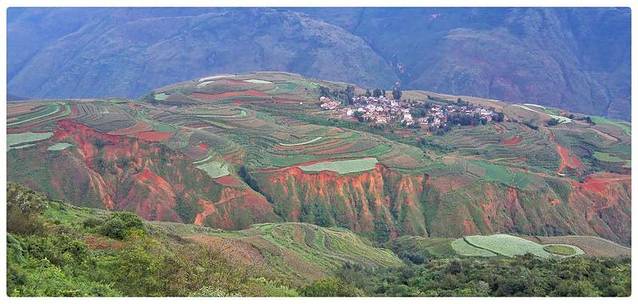 云贵高原上有一片绚烂的土地,赤、橙、红、绿、青、蓝、紫,像彩虹一般,那似乎是被远古天地塌陷后燃起的天火狠狠地燃烧过,才有了如今这般艳丽到极致的色彩。入秋之后,则艳之更甚,灿之愈烈!东川红土地位于一个叫“花石头”的地方(在109km程碑处),这里方圆近百里的区域是云南红土高原上最集中、最典型、最具特色的红土地,被专家认为是全世界除巴西里约热内卢外最有气势的红土地,而其景象比巴西红土地更为壮美。
