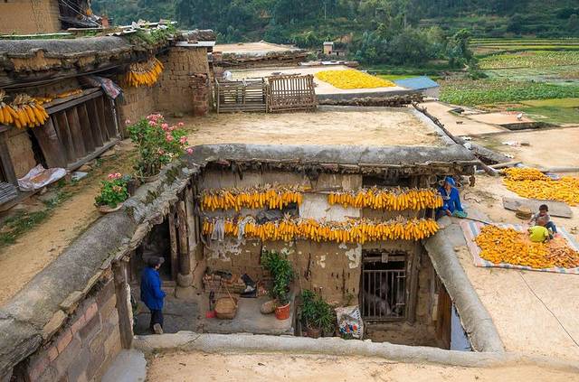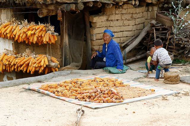 人物、黄玉米、登上土掌房屋顶拍摄