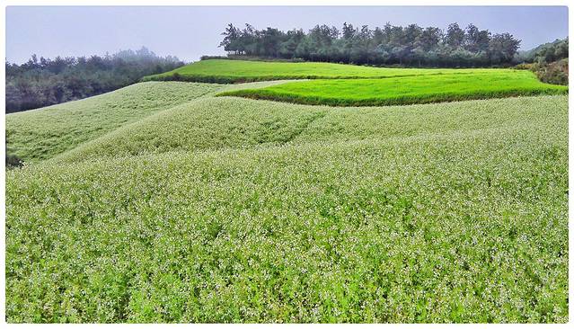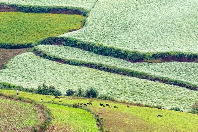 春季:拍摄开满荞花和洋芋花的田野,红白色块明亮可人;
