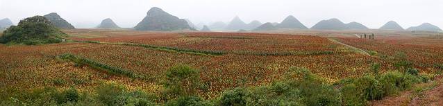 在金秋浪漫时节,云南罗平2万余亩连片红高粱景观十分迷人,蔚为壮观,观景地方就在金鸡岭,也是观看油菜花的地方
