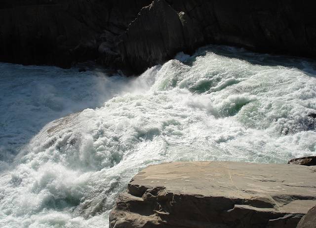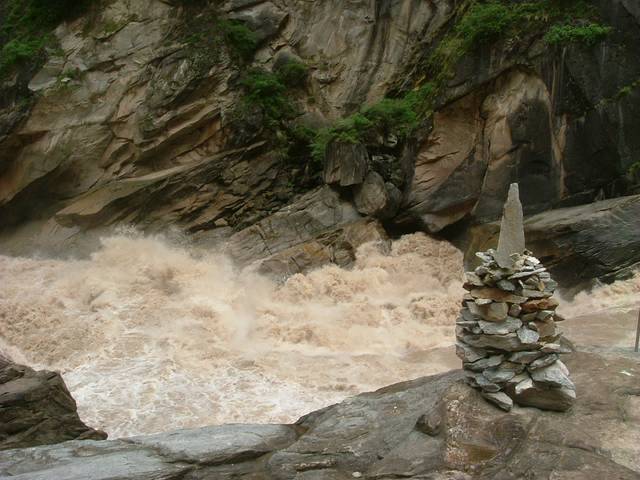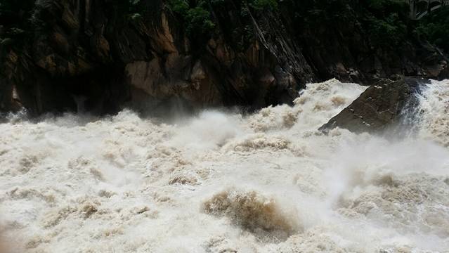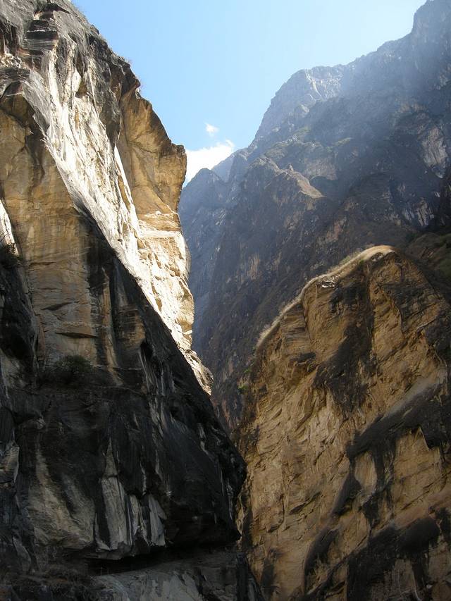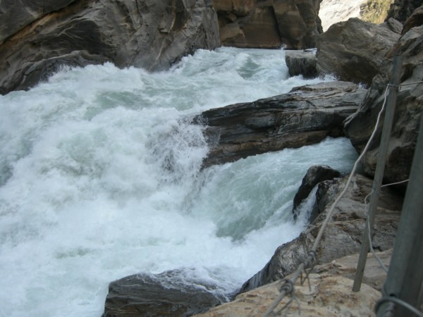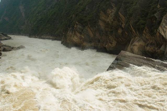 上、中、下三段,中间有18个险滩。江面从玉龙和哈巴两座雪山之间激流而上,两座雪山的海拔分别为5596和5396米,最大高差3900米。相传老虎可以蹬踩江中的一块巨石,跳过金沙江。穿越过这样一条峡谷,所有的惊险、壮阔,山川的秀美,以及身体的耐力、意志的坚强、克服困难的勇气,都目睹过了,经历过了,检验过了,世上再没有什么可以害怕的了。