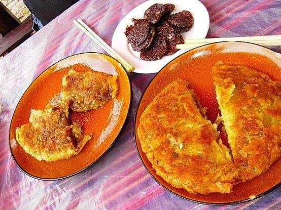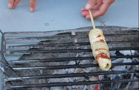 饵块烤熟,然后在里面卷上火腿肠,土豆丝,抹上辣酱,我的最爱啊。大街小巷都有。