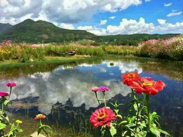 丽江10月拍摄:国庆花、芦苇、拉市海夕阳黄昏。