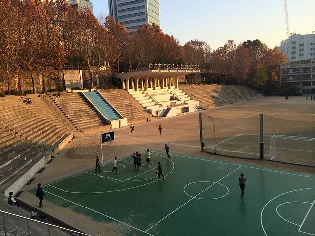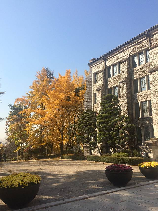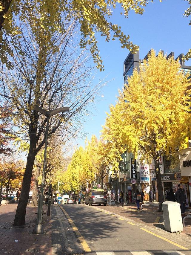 地铁2号线梨花大学站2号出口正对着就是梨大前街,笔直走就是梨大校园。秋天的梨大前街真是极美,到处都是黄色红色的各色叶子,地上铺满了落叶。