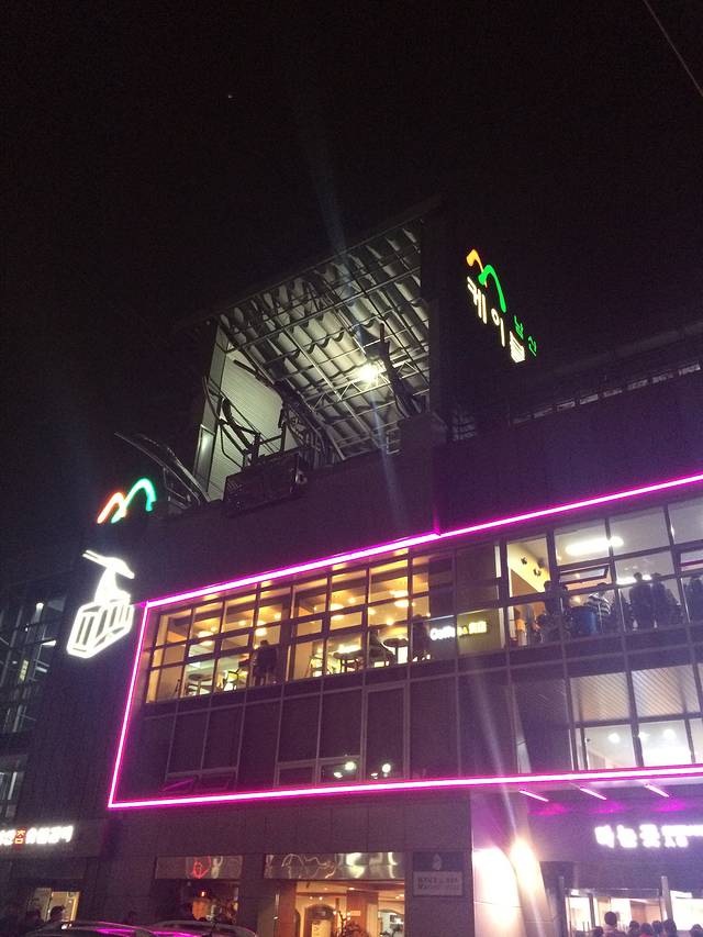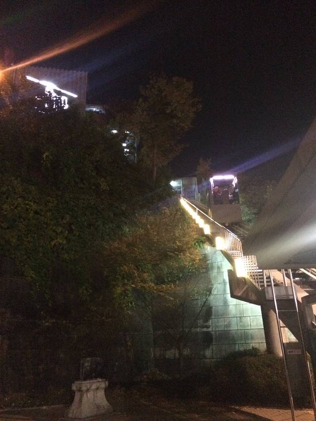 要上南山塔,先坐一段玻璃扶梯到山下售票处,然后坐缆车上去,就好像是太平山半山扶梯和缆车的关系。千万不要以为那段玻璃扶梯就是缆车啊!我们前面排了超多人,不断看见有人离开队伍爬山上去,终于排到我们坐过扶梯才知道。那一段很短啊,爬山的话撑死也就15分钟啊,可是我们白白排了大半个小时,才坐了2分钟电梯就到了...排队的时候前面后面都是韩国小情侣,看来大晚上来找浪漫的人真是不少。(这所谓的扶梯,照片上能看出来距离很近,如果人多又冷,真没有排的必要。)