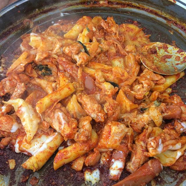 女人街逛逛走走到尽头就是新村地铁站。这时候肚子饿了,于是决定去吃春川家辣炒鸡排。开着导航走,终于找到了。(这里吐槽大众点评的地图,真心不好用!强烈建议把地址复制到Google地图。)门头是酱紫的,没有中文,很容易错过。