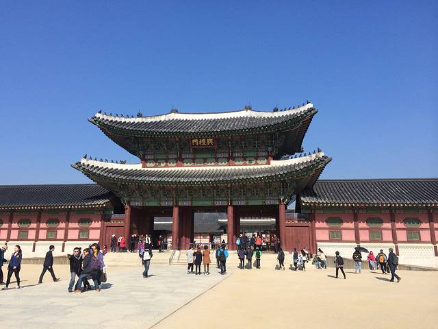 景福宫正门。景福宫建于1394年,是李氏王朝的正宫,也是韩国封建社会后期的政治中心,得名于诗经中“君子万年,介尔景福”。据说景福宫是依照天上星宿排列而设计。开放时间:9:00-16:00。门票3000韩元每人。
