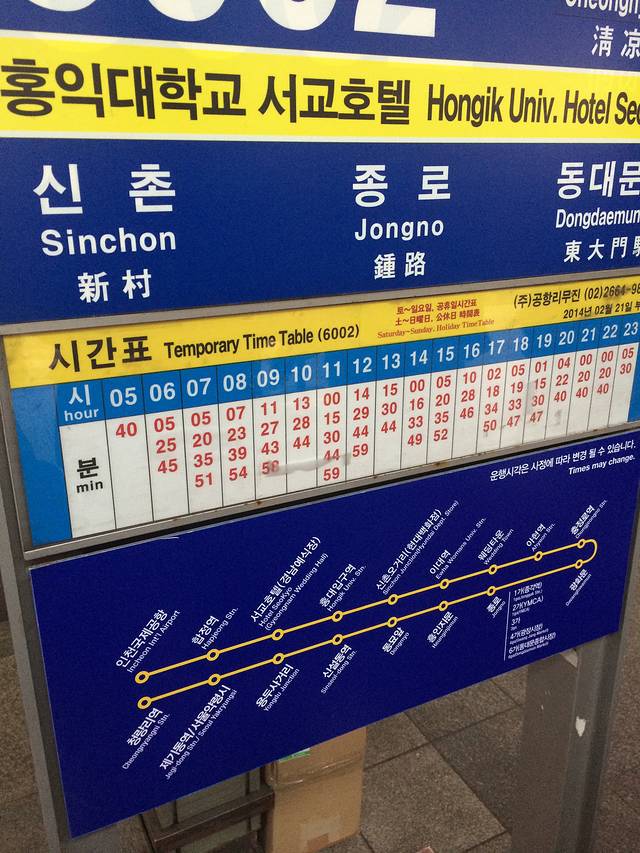 之后就是坐机场大巴进城啦。关于从机场到市区的交通方式,地铁肯定是更经济实惠的选择,不过如果带着行李,大巴站离酒店又比较近,这肯定是更方便的选择。韩巢网上有优惠券,不过我忘记下载,现场买票一人1W韩元。沿着机场大巴指示牌一路走就到售票处,买完票到相应的站台候车就好。至于具体坐哪一路在哪一站下车还是提前做好功课吧,我是在酒店给出的入住信息里看到的。上车前把站牌照一下,数着站下车不会坐过站。