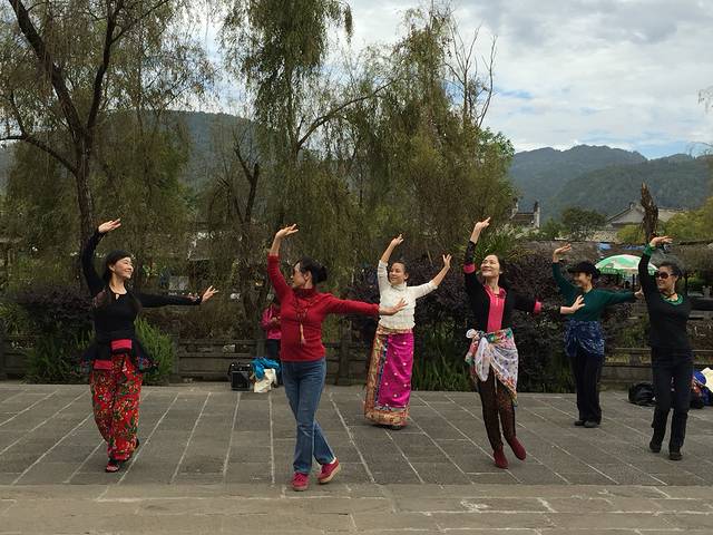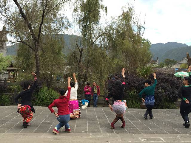 过了双虹桥算真正进入和顺,下桥左边有一个小小的广场,昨天下午有三只文艺青年坐台阶上唱歌,今天上午是一个美女独自跳舞,别说跳得还真不错。游客来来往往,围观的有人起了兴致,陆续加入,居然跳得有模有样。