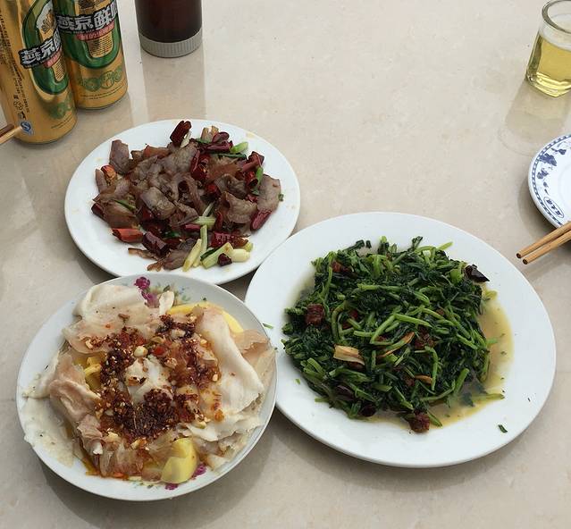 【中餐】刘记家庭餐馆,他家没客栈,专做餐饮。点的三个菜,自家腌制的腊肉、大薄片、野香菜炒豆丝饼,两听啤酒,分量正好。