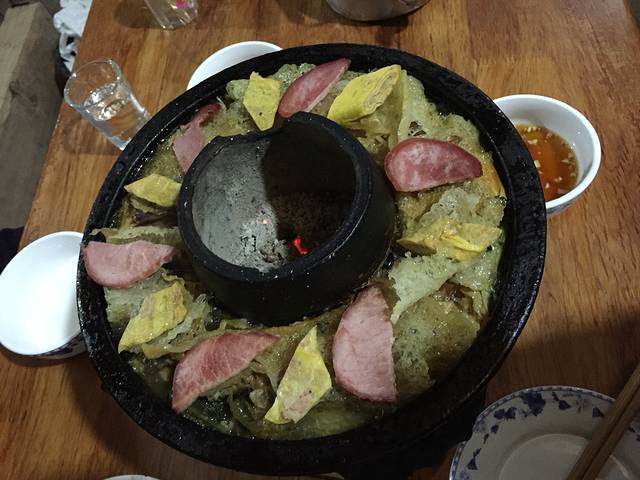 类似火锅,不同的是靠炭火把菜慢慢煨熟的,菜是一层一层码上去的,有乌鸡、排骨、肉皮、不知道什么肉、竹笋、芋头、胡萝卜、青菜、火腿、蛋皮卷肉,还有一种透明的像脆皮豆腐样的,老板说是肥肉做的,反正吃得不像肥肉,很好吃的。喝了酒才把这些吃完。