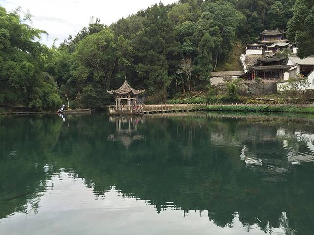 龙潭的水碧绿清澈,想必潭水很深,藏得住龙哦。右边依山而建的是元龙阁,没买票不让进。