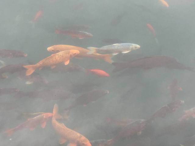 龙潭里的鱼。没人喂食,水面也这么多游来游去的。水够清吧!