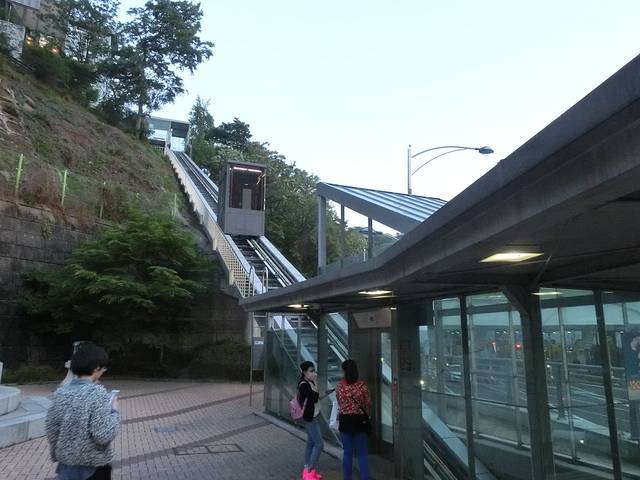 上南山一般是步行或者搭乘南山缆车。我原先想,如果白天去的话,学学很多其他游客,上山缆车,再步行下山,这样可以更好地欣赏南山的景色,不过晚上去的话,黑灯瞎火地在山上转悠,一没意思,二也不安全,就采用双程缆车的方案。南山缆车站并不在山脚,而是在山腰。09年以前,要搭乘缆车,不管你愿意不愿意,得先走一大段山路才能到,现在好了,多了个南山透明电梯,可以将游客免费且快速地送到缆车站入口。