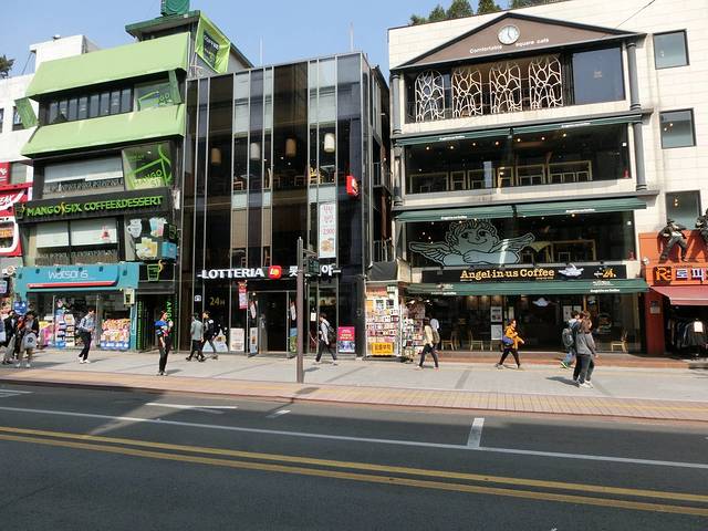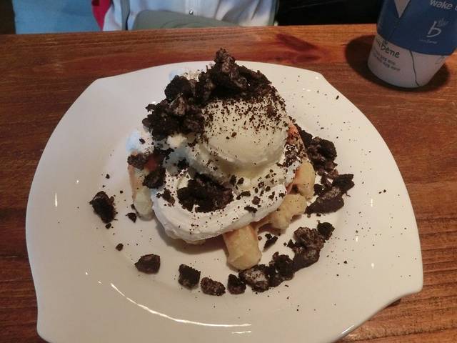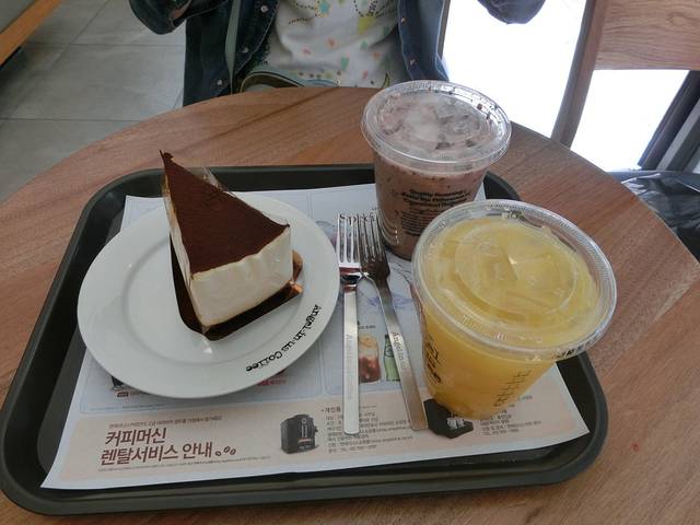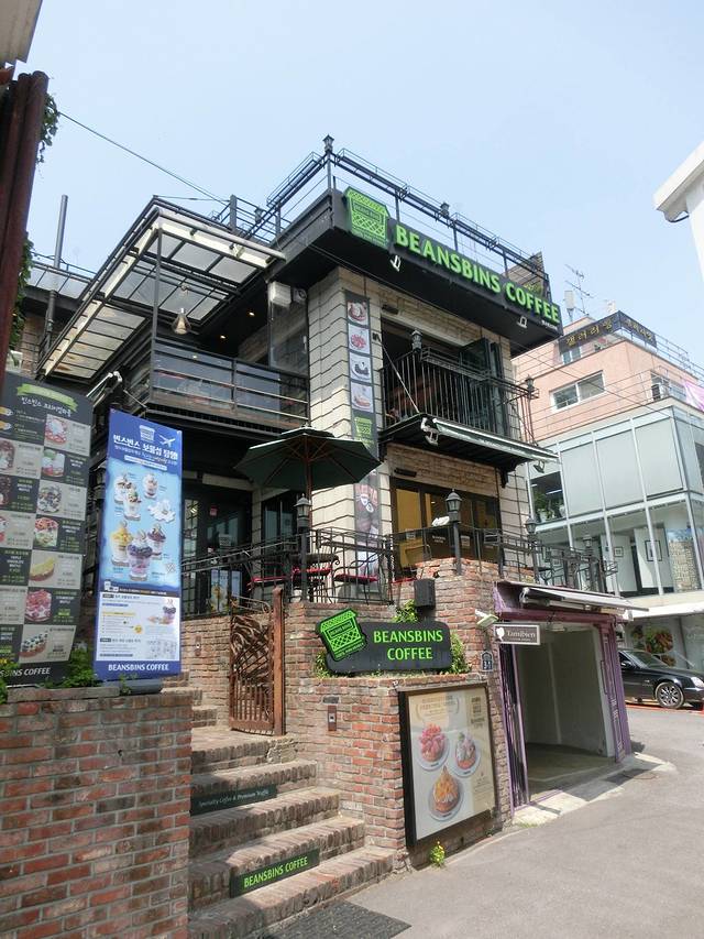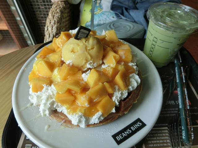 看完崇礼门,LP和我又无目的性地在附近东转转、西走走,主要是摸摸附近一带道路和店铺的情况,顺带看看有什么好吃的。走累了,就在一家Cafe Bene喝杯咖啡,吃点东西。Cafe Bene连锁店数量虽不及星巴克那么多,但要找到也绝非难事,威斯汀朝鲜酒店附近就有一家。LP喝抹茶拿铁,这玩意儿她在首尔的4天喝了好几杯,回国前还带回一包速溶装的,而我随意点个咖啡,至于点心,就先尝了Cafe Bene的冰淇淋奶油华夫饼。