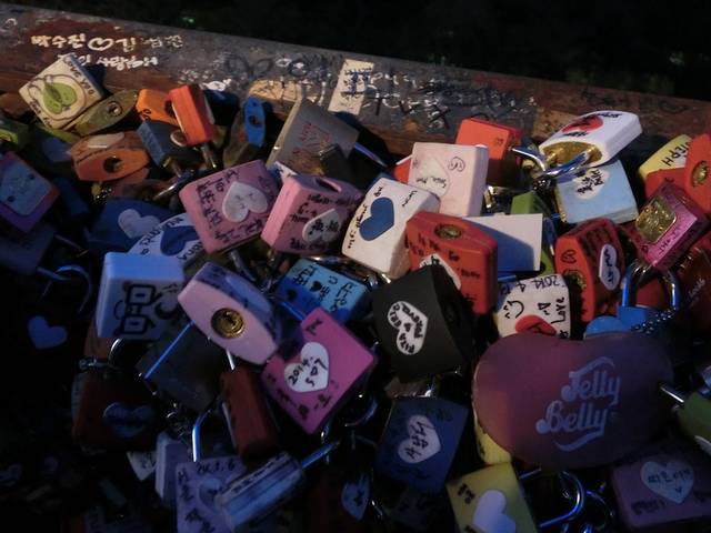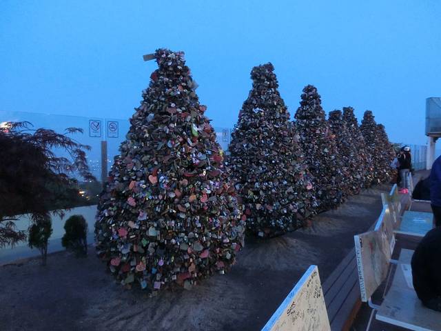 塔下的平台上,无论是围栏,还是树状装饰物,都被各色各样,大大小小的爱心锁包围。谁让首尔塔成为首尔青年男女约会的好地方呢?