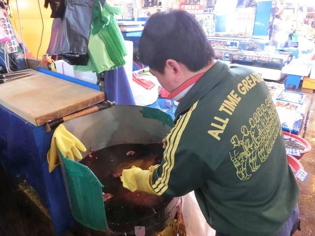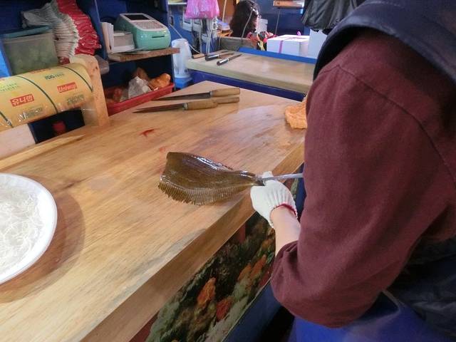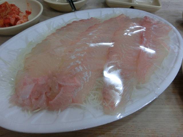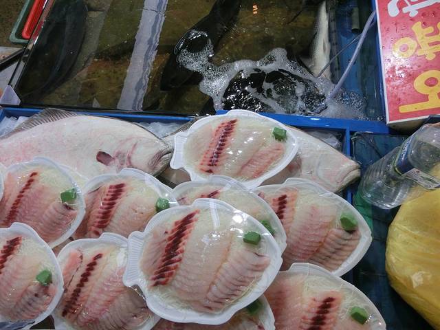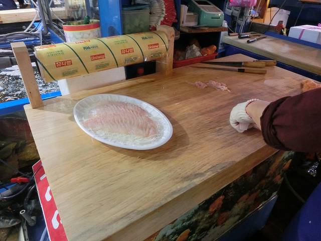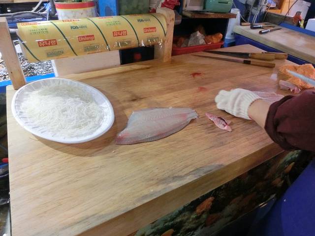 活的比目鱼价格基本上固定在20000韩元/公斤。在一家摊位上,伙计替我们挑了一条不算很大的,一称,1.5公斤,正好30000韩元。接下去开始讨价还价,我先试着问他能否便宜点,他倒是很爽快地回答,那就28000好了,我本来想压到20000,不过没喊出口,而是叫了个25000韩元,他有所迟疑,回头问了问韩国老板,那个人想了想,同意我的报价,以25000韩元成交。随后伙计就把称好的鱼交给旁边处理生鱼片的另外一人。杀鱼的伙计立刻用水洗净砧板,一把刀拿手上,围着鱼就是“刷刷刷”地处理起来,极为熟练,2-3分钟功夫,一整条黄褐色的比目鱼在我眼前消失了,取而代之的是一盘雪白的生鱼片。这里的摊位,都免费提供用塑料泡沫盘子盛放生鱼片,外头用保鲜膜包好,这样就不用担心生鱼片被污染了。除了生鱼片,比目鱼的鱼杂和边角料都会单独用袋子放好,也交给我,具体有什么用,后面再说。有一些摊位,还有已经处理好装盘的生鱼片,如果懒得挑,直接买也行,价格上要比现买现杀的要便宜点。