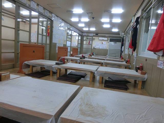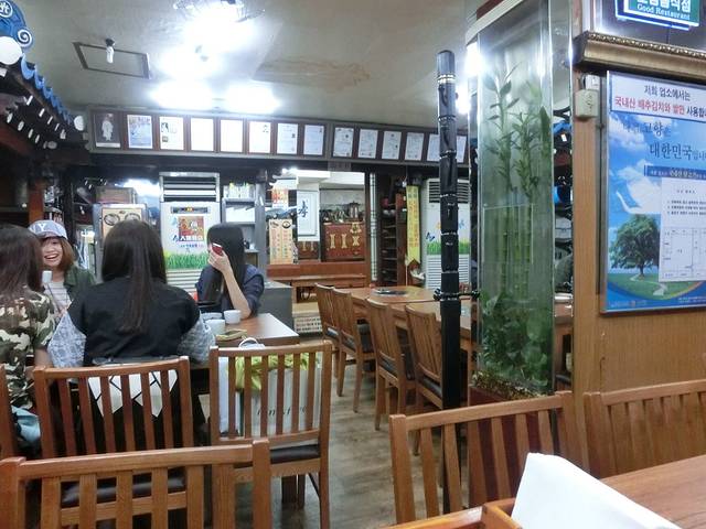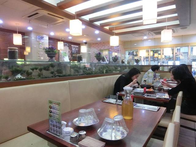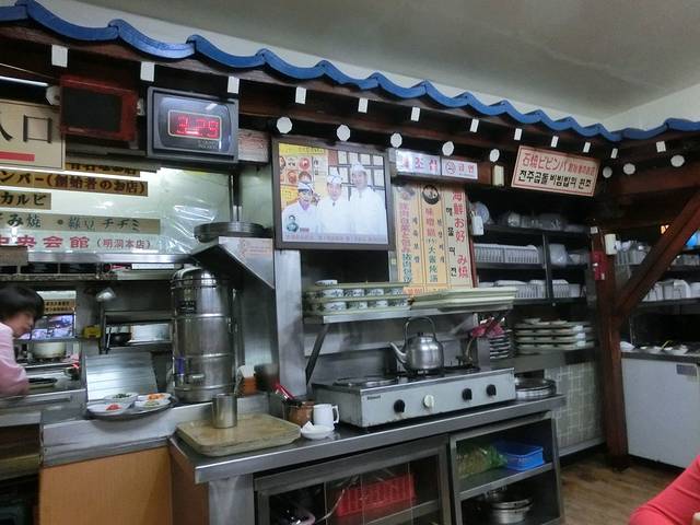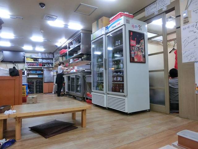 店内不大,外区是桌椅,内区是韩式坐席,由于是下午,人不多,所有客人都在桌椅区就餐。厨房、收银区等都在就餐区四周,从照片上看就是家很传统,有年头的店。墙上挂着的很多年代久远的照片、文件和物品。
